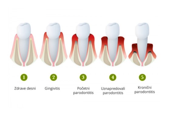 Parodontitis započinje upalom gingive, koja je crvena, bolna i krvari na dodir, a ukoliko se ne liječi, prelazi u parodontitis kad može doći i do ispadanja zuba. Parodontitis obuhvaća područja alveole, zubnog korijena i mekih tkiva koja ga okružuju.